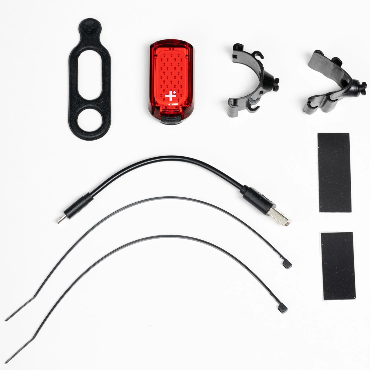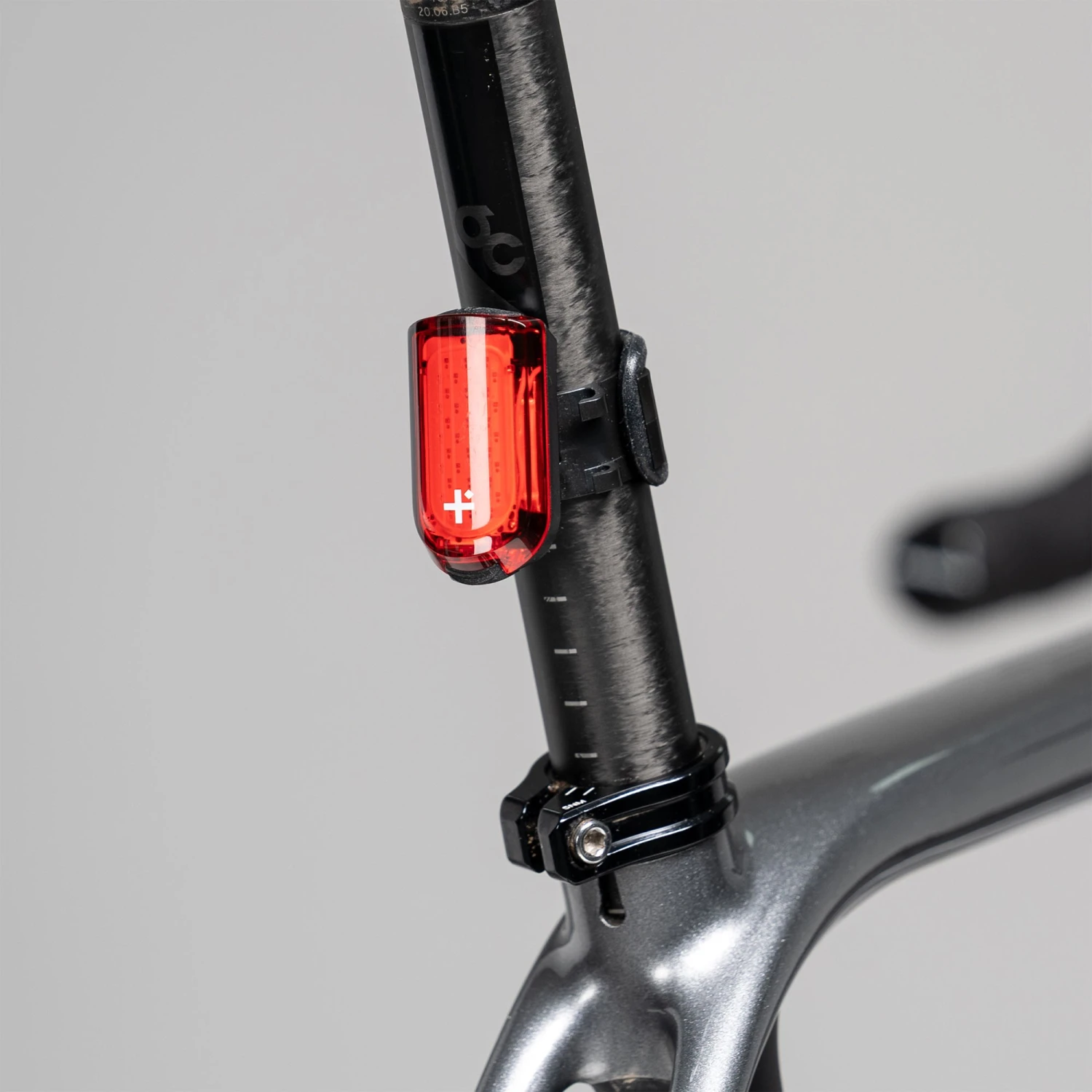 Vel’s 20 Lumen Rear Light offers versatile mounting options thanks to the included straps, so you can attach it to a round or aero seatpost, your helmet, saddlebag or backpack. It is compact, light and durable, with a water-resistant construction for use across all conditions.Â