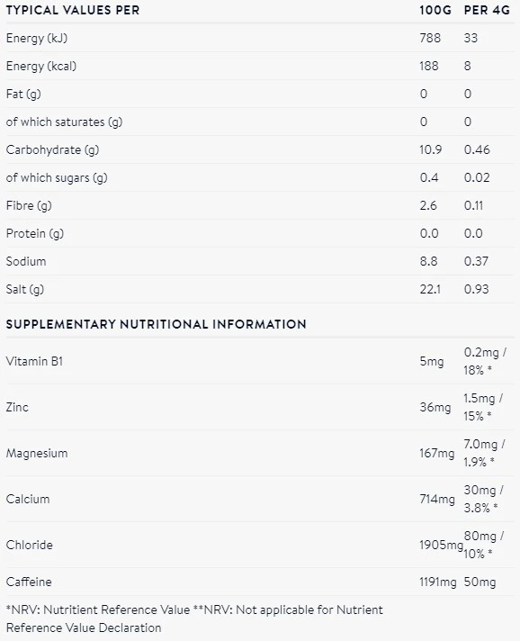 Acid (citric acid), acidity regulator sodium hydrogen carbonate, humectant sorbitol, guarana extract powder* (guarana extract, maltodextrin), inulin, flavouring, sodium chloride, sweetener steviol glycosides, calcium carbonate, potassium chloride, caffeine anhydrous**, tricalcium phosphate, magnesium carbonate, red beet juice powder (maltodextrin, red beet juice powder), zinc sulphate, pyridoxine hydrochloride (vitamin B6), riboflavin 5′-phosphate-sodium (vitamin B2), thiamin hydrochloride (vitamin B1). 15mg caffeine per portion **35mg caffeine per portion.