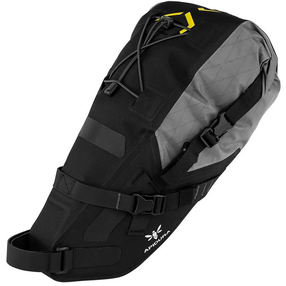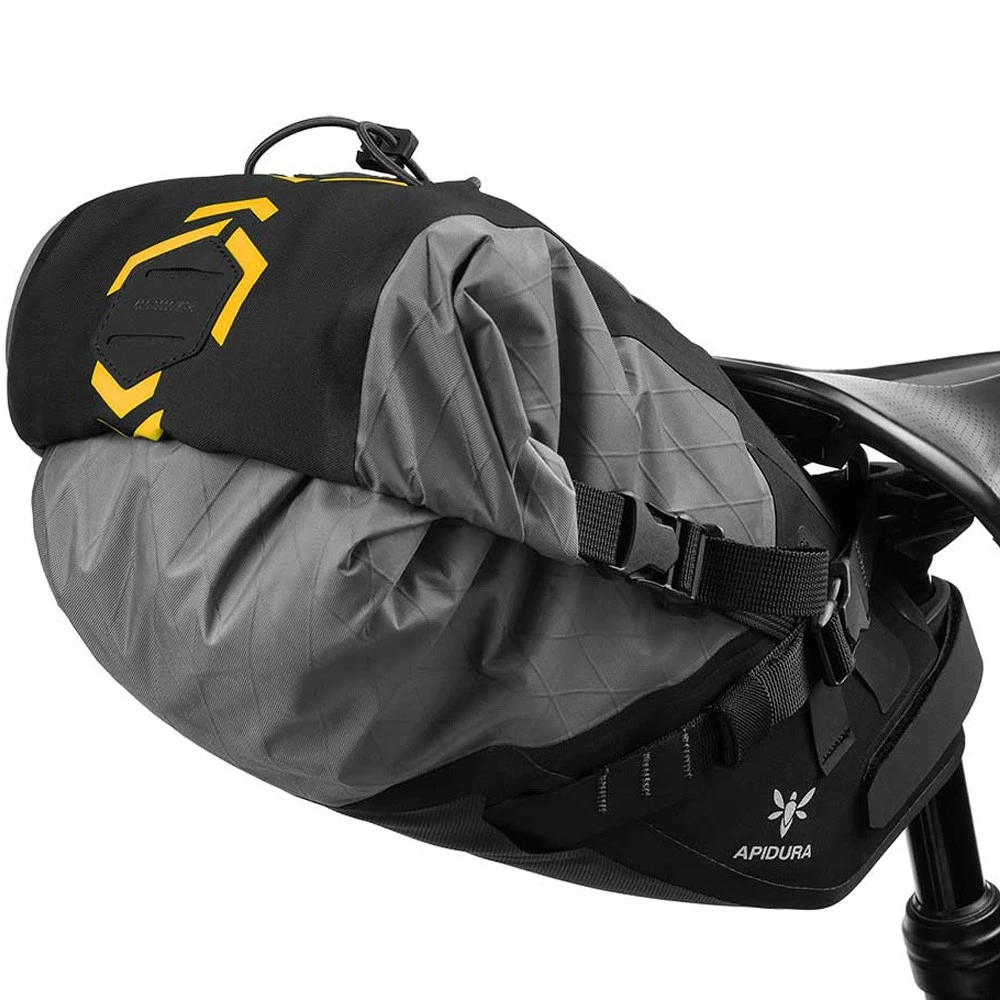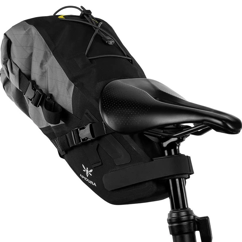 The 6L Backcountry Saddle Pack from Apidura is the perfect way to carry light, bulky items like clothes or a sleeping bag as the roll-down closure allows the contents to be compressed down and kept stable whilst riding. The waterproof Dimension-Polyant VX21 fabric has welded seams for full weather protection and has Hypalon patches for reinforcement on potential wear areas and on the wide Velcro straps. Externally, there is a loop to attach a light to and reflective details to aid low light safety on the road as well as a bungee cord for stashing extra layers that might need to be deployed rapidly, such as a waterproof jacket.