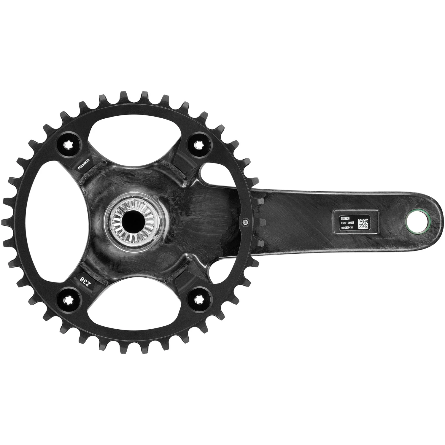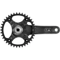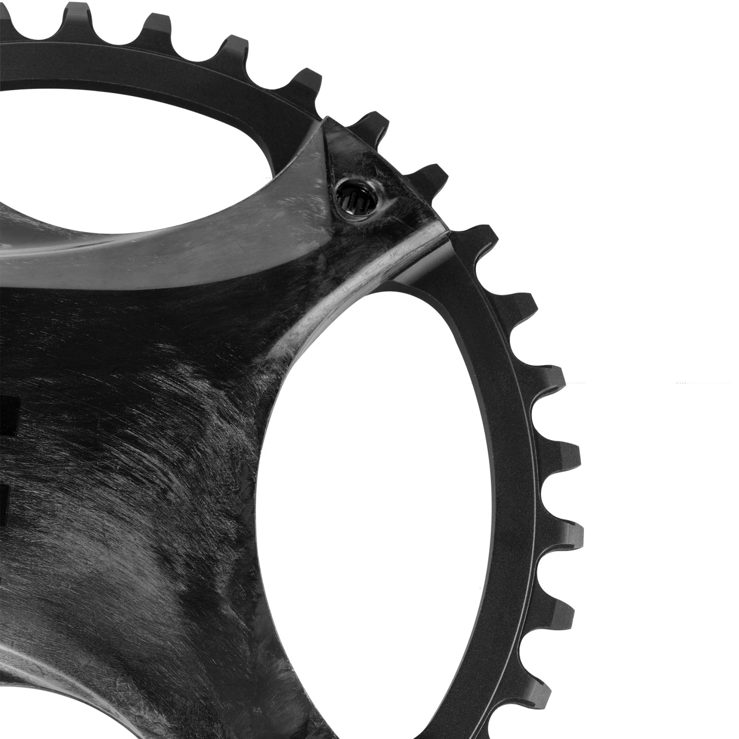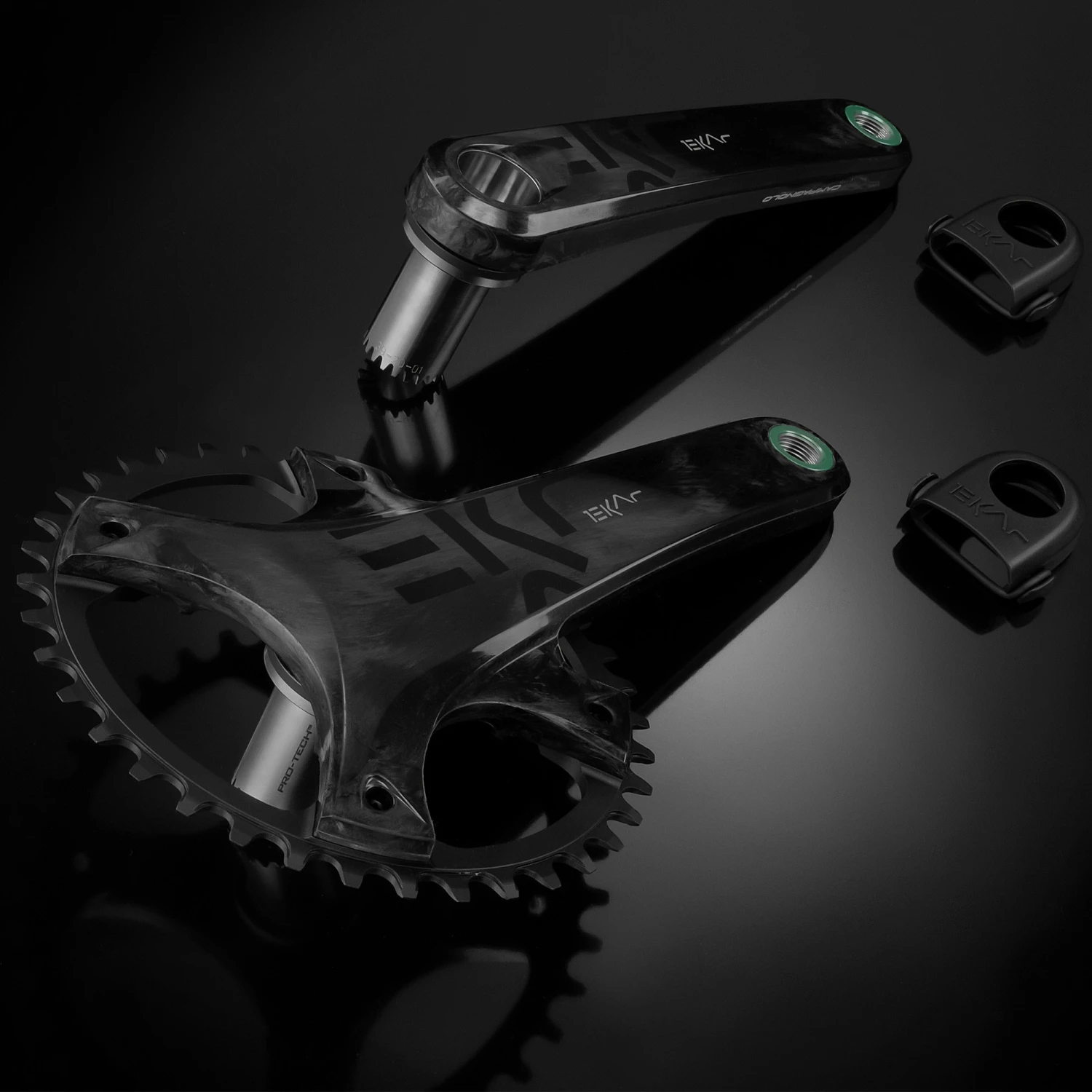 Campagnolo’s Ekar Chainset is for use with their 13-speed gravel-specific groupset. It is made with carbon fibre arms and a steel axle in order to benefit from both high strength and low weight, with the simple 4-bolt design allowing for easy chainring swaps without disassembling the cranks. The chainring’s narrow-wide design keeps the chain secure across rough ground and increases drivetrain efficiency.