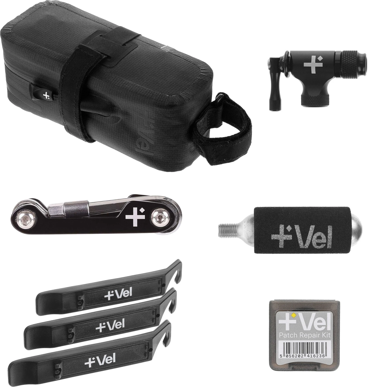 The Vel CO2 Starter Kit contains everything you need to repair a puncture, re-inflate a tyre or perform small bike maintenance tasks or adjustments out on the road or trail, including the saddle bag to store it all in.Â