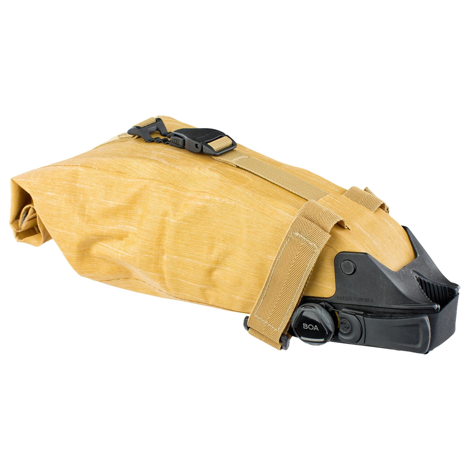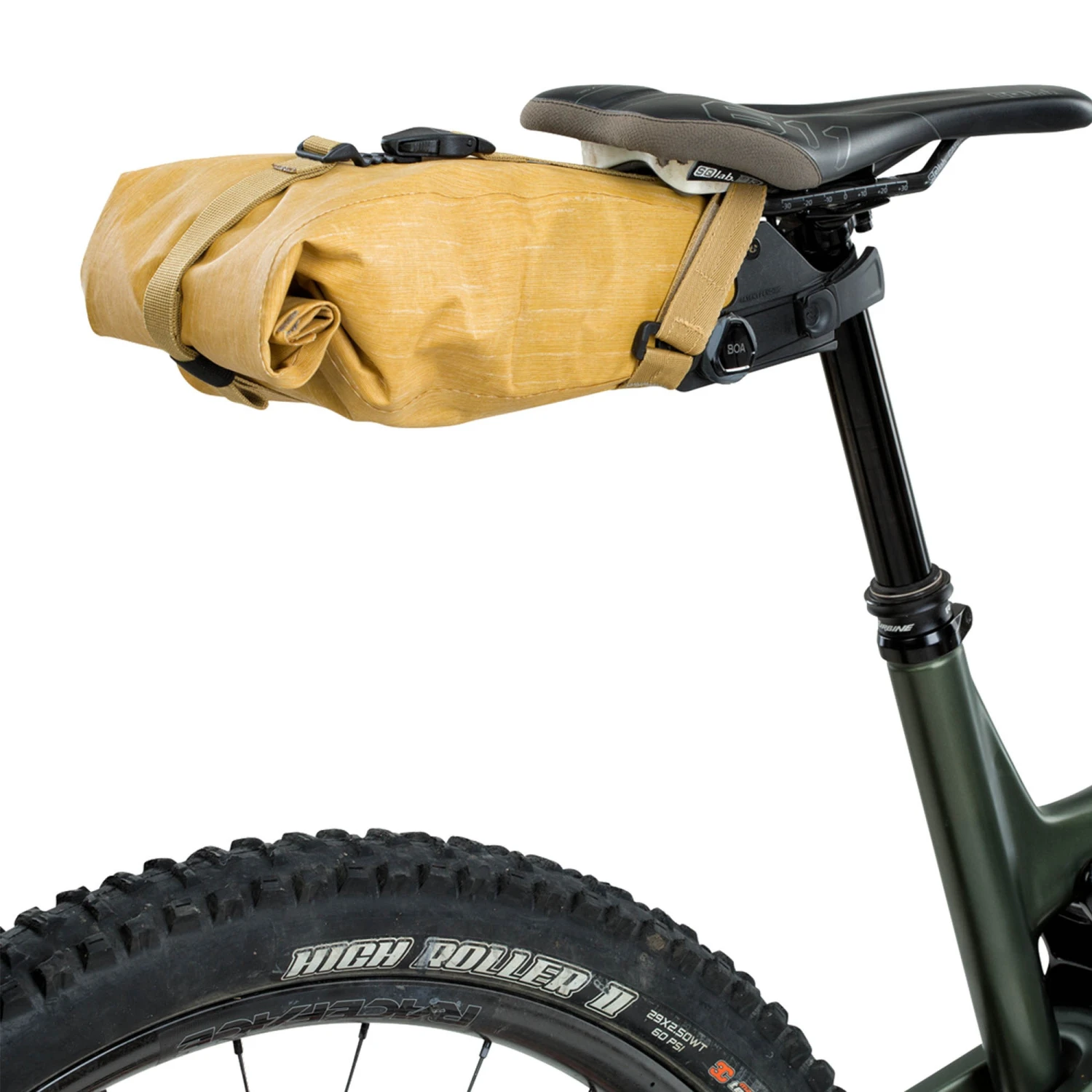 EVOC’s Seat Pack has a 3-litre capacity and durable construction. It attaches to the seatpost and saddle rails using a Boa system and velcro straps, and soft TPE protects the seatpost from damage. With a roll-top closure, the size of the pack can be adjusted to suit the contents. This bag is even compatible with dropper posts so you can use it on your MTB too.