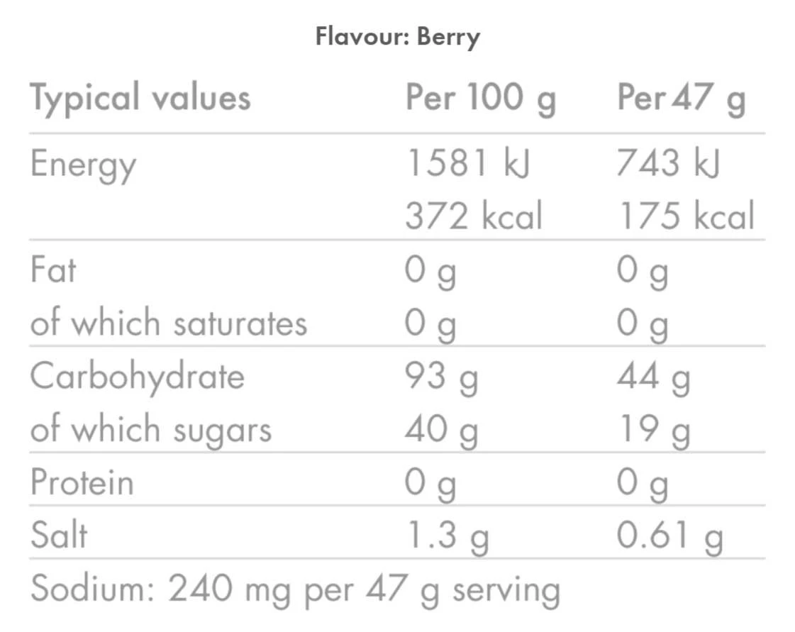 Berry: Maltodextrin, Fructose 32%, Food Acids (Citric Acid, Malic Acid), Acidity Regulators (Sodium Citrates, Potassium Citrate), Natural Flavourings, Sodium Chloride. May contain traces of gluten, egg and/or milk.