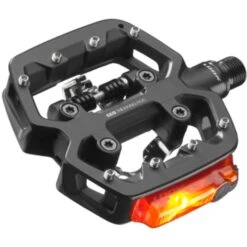 Look’s Geo Trekking Vision Roc Pedals bring together the versatility of a hybrid pedal with the additional safety of a clip-on light. The aluminium body and Chromoly+ spindle make for a robust construction that can cope with the worst conditions. One side the pedal is flat for use with normal shoes and trainers, while the other is compatible with SPD pedal systems using the included X-Track Easy cleats. Retention is adjustable and, in combination with the easy release cleats, means that clipping in and out can be dialled in. The light itself clips on to the pedal, has three modes including steady and flashing, and a long battery life. The watertight construction means it won’t let you down in poor conditions.