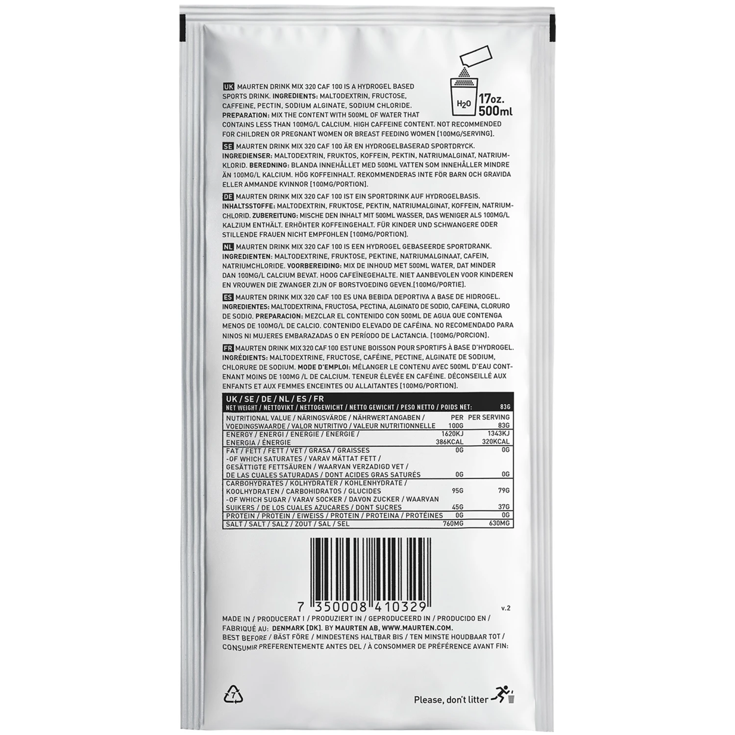 Delivering high levels of carbohydrates, alongside caffeine and electrolytes, in a safe and highly efficient way, the Maurten Drink Mix 320 CAF 100 is the perfect partner for your workouts. Supplied in a box of 14, you’ll be well stocked for a number of training sessions and races, be that short, intense sessions, or in combination with other Maurten products for longer durations.Â
