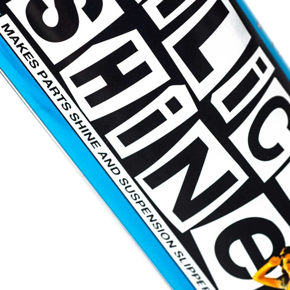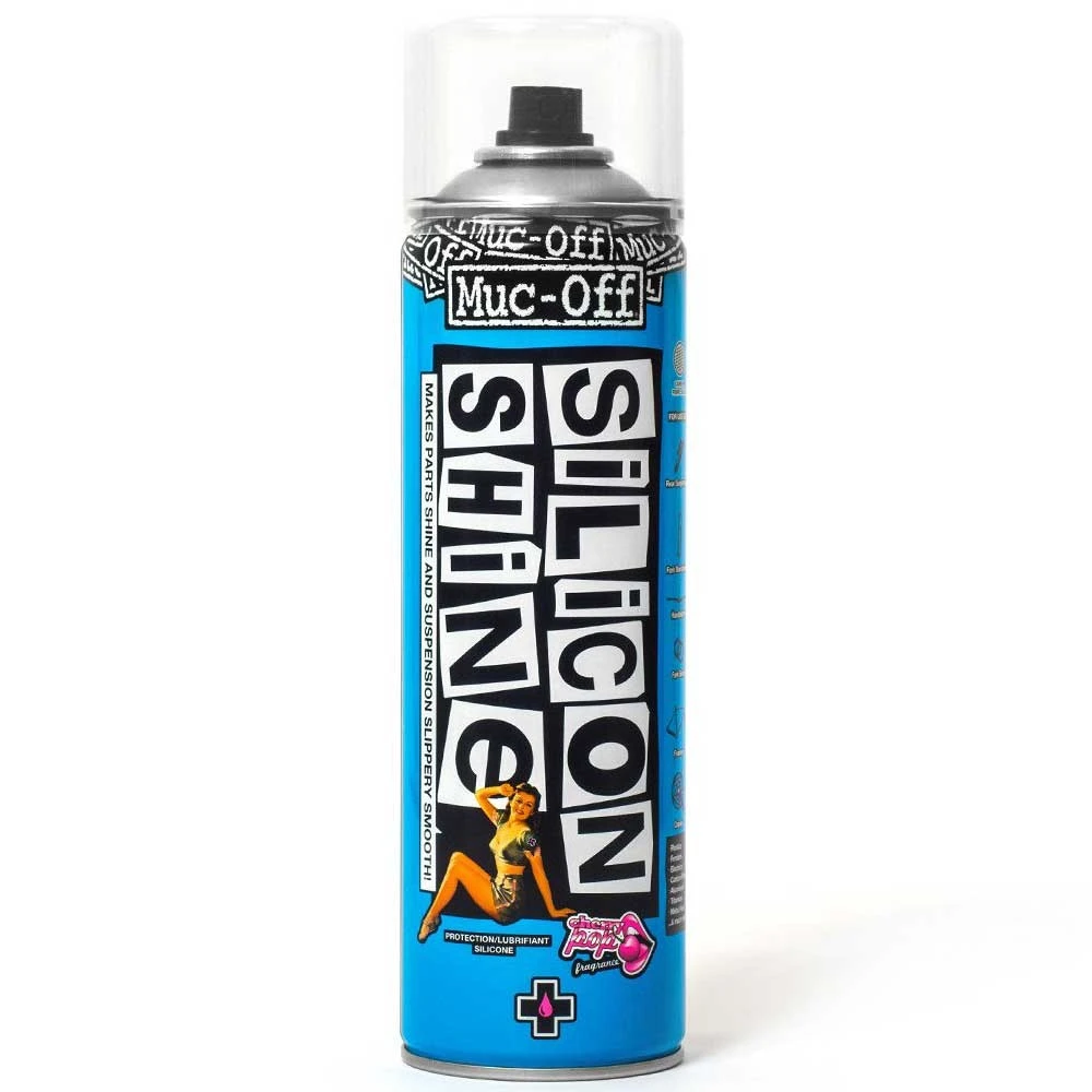 Fresh from the Muc-Off Research and Development Lab comes the ultimate bicycle detailer! Muc-Off Silicon Shine not only leaves your bike looking and smelling divine but it’s also an amazing friction reducer for suspension parts. Spray it on to your fork stanchions and shock to reduce resistance for a silky-smooth performance. Silicon Shine is completely safe to use on paint, chrome, all-metal parts, carbon fibre and all other composites. It won’t swell or soften rubber and plastic parts.