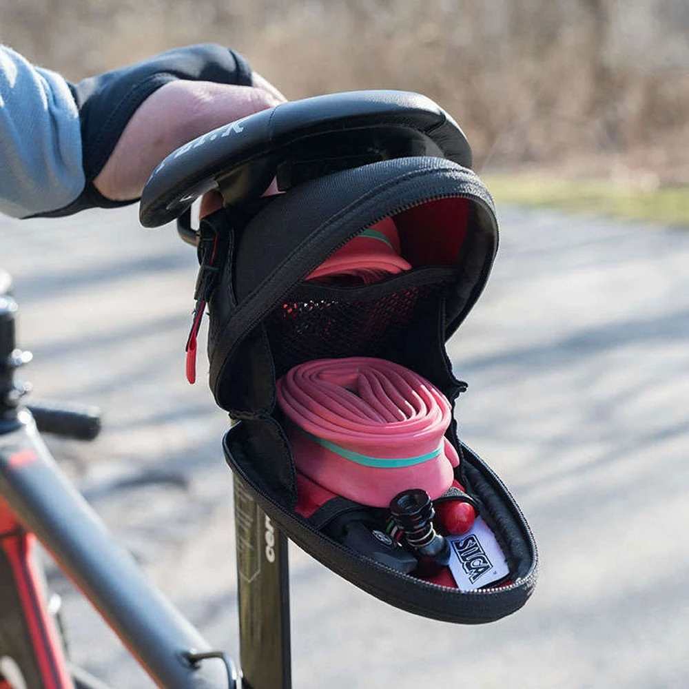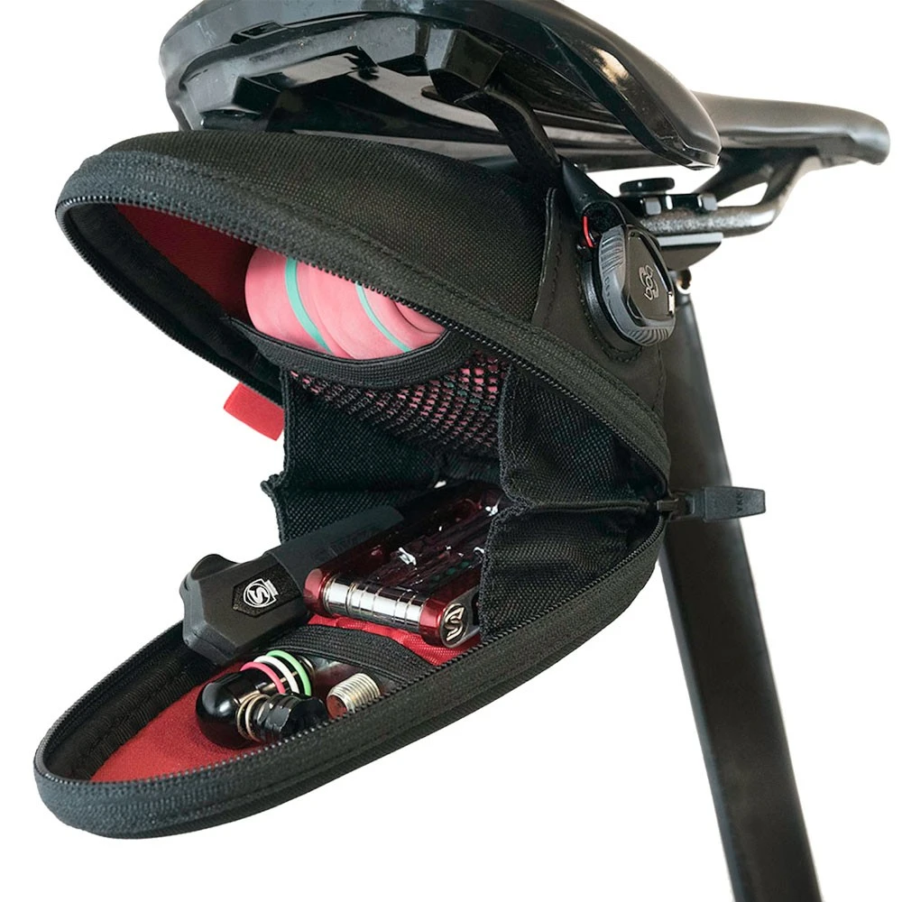The 625cc storage capacity is excellent in relation to the perceived volume of the bag. There is enough storage space to carry up to two 700x30mm inner tubes, along with a multi-tool, a CO2 regulator and up to three CO2 cartridges using the internal pocket dividers.