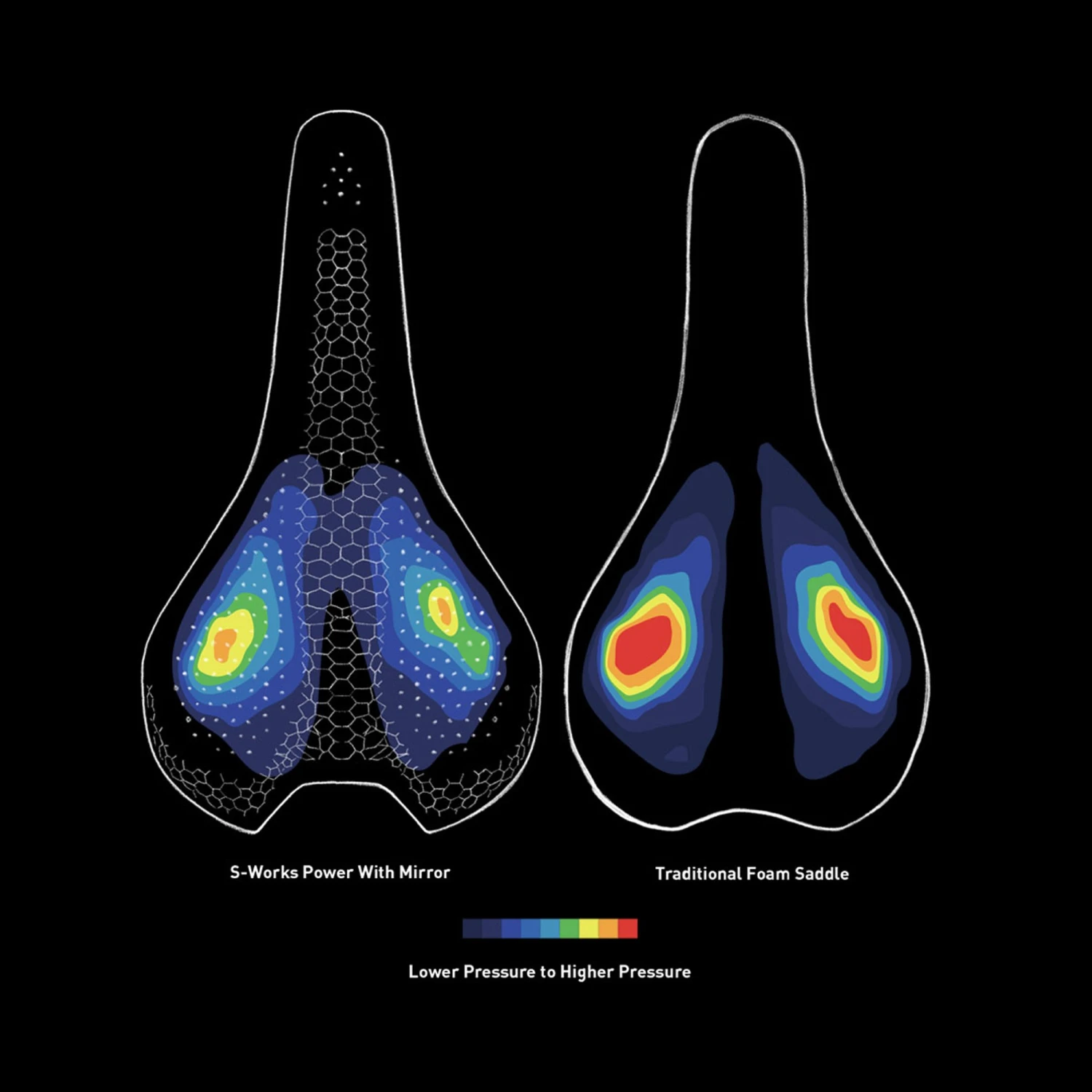 The Mirror padding incorporates a broad and deep ergonomic central channel to help protect the rider’s sensitive blood vessels and nerves routed through the perineum. Additionally, this cutout shifts weight onto the pubic rami bone structure, creating more support for the rider when pedalling output is at its maximum.