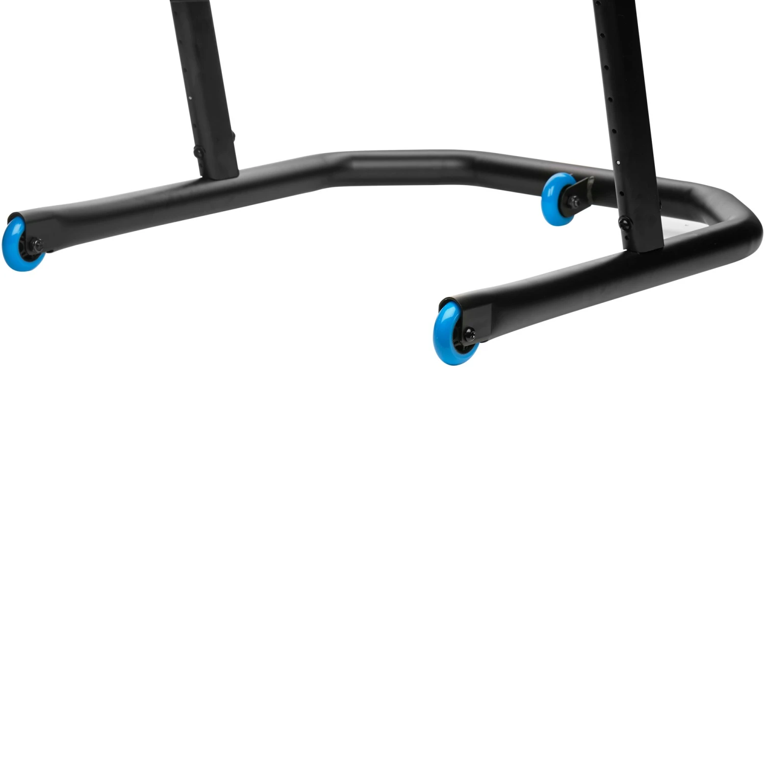 The frame is constructed with strengthened steel that keeps everything sturdy, while a slip-resistant surface keeps all your bits in place. The rubber wheels on the bottom of the frame also make it easy to move around – especially useful if you’re switching in and out of training at home or the office.