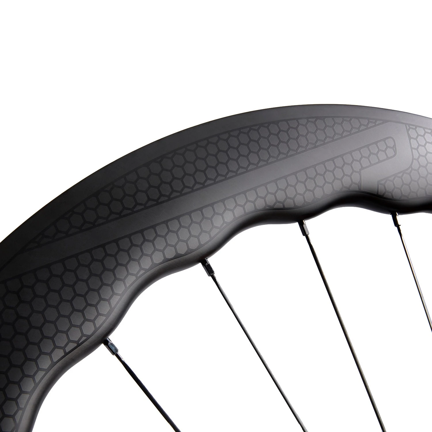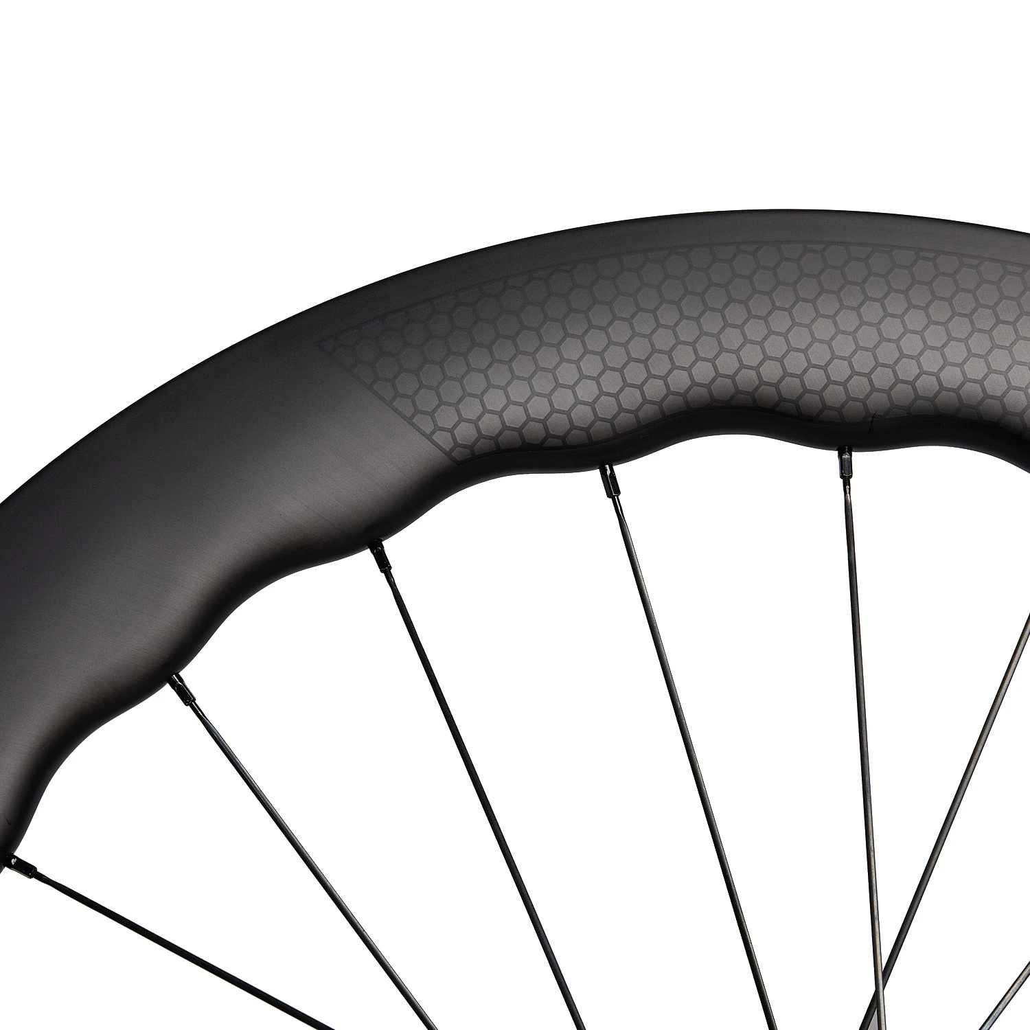 The sophisticated carbon composition of the rims naturally infuses generous amounts of pedalling efficiency while still keeping the weight low. This lofty grade of carbon is moulded into a “sinusoidal”, wavy rim profile that varies between 65mm and 60mm in depth to improve aerodynamics and keep crosswind stability high. This irregular profile also strengthens the spoke nipple contact points, reducing peak loads in these areas for heightened resilience and responsiveness.